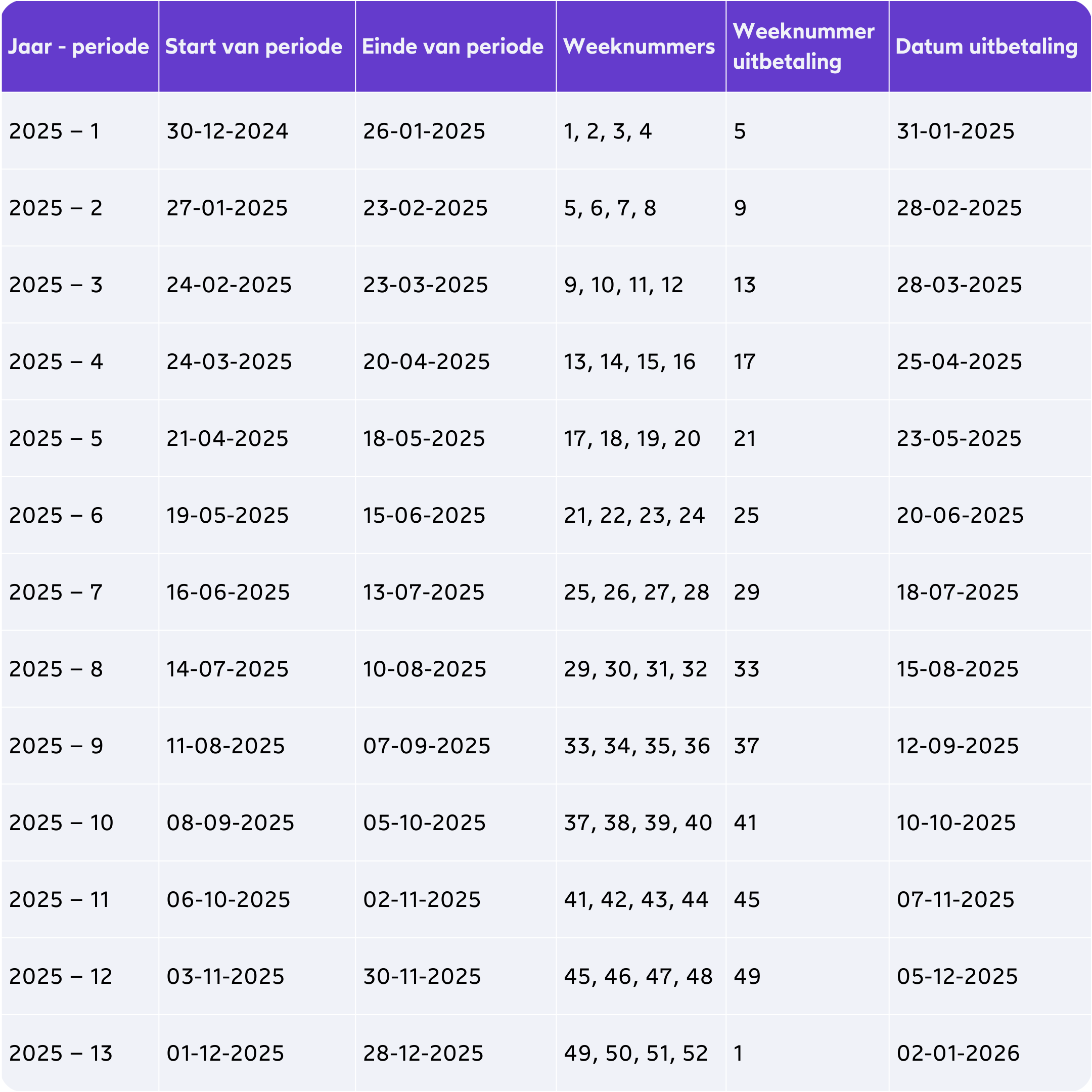Ontvang je je salaris elke 4 weken? De volgende tabel toont alle salarisperiodes en de bijbehorende betaaldata.