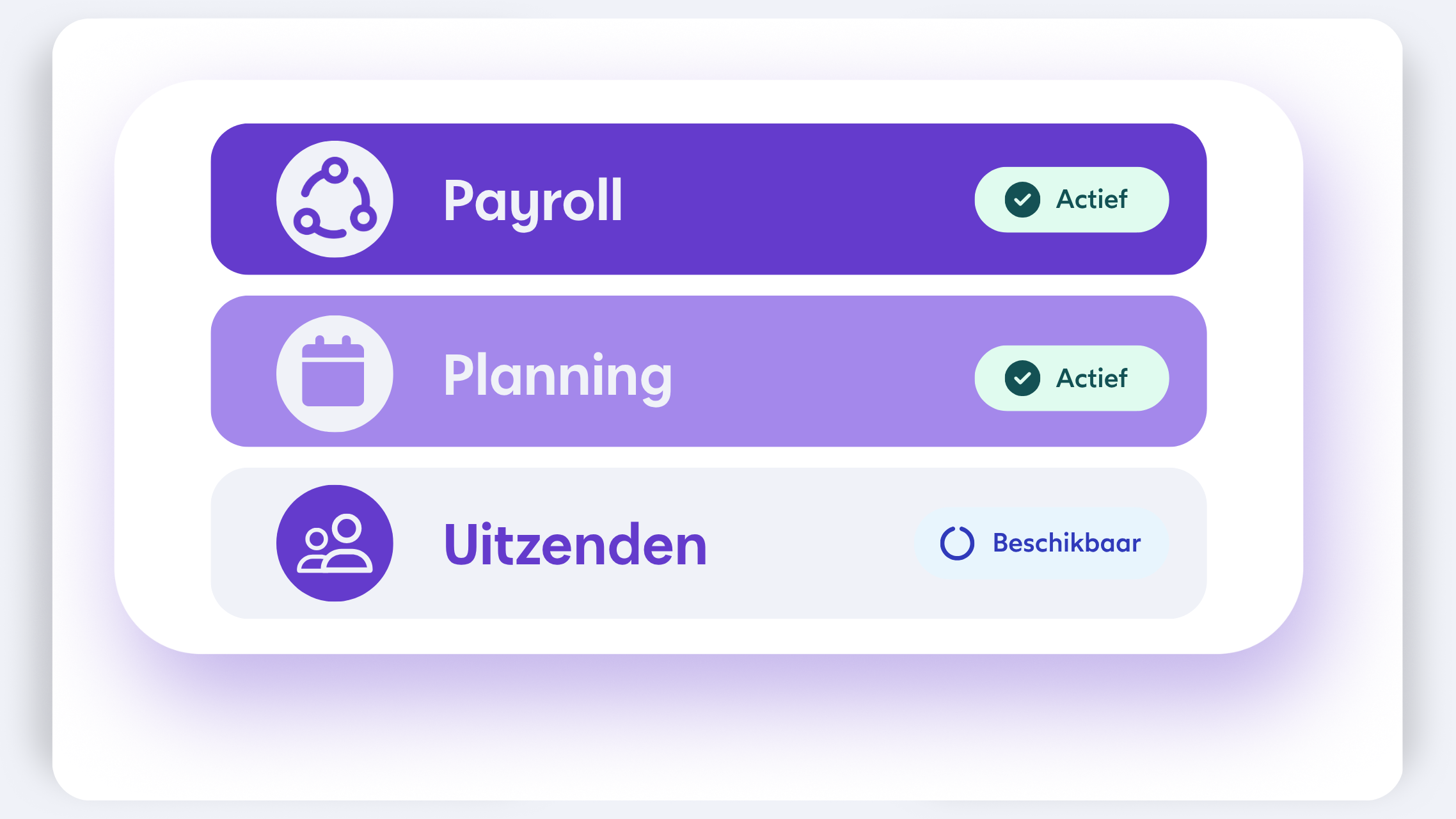 Alle modules kun je met elkaar combineren. Jij kiest wat je nodig hebt, wij nemen de financiële en juridische werkgeverrisico’s van je over.